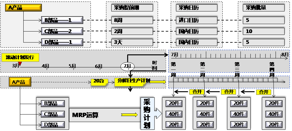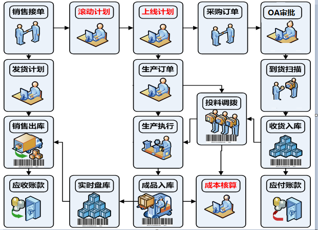 1. 銷(xiāo)售接單后,計(jì)劃部門(mén)編排1個(gè)月的滾動(dòng)計(jì)劃,MPS運(yùn)算出生產(chǎn)計(jì)劃、MRP運(yùn)算出采購(gòu)計(jì)劃。