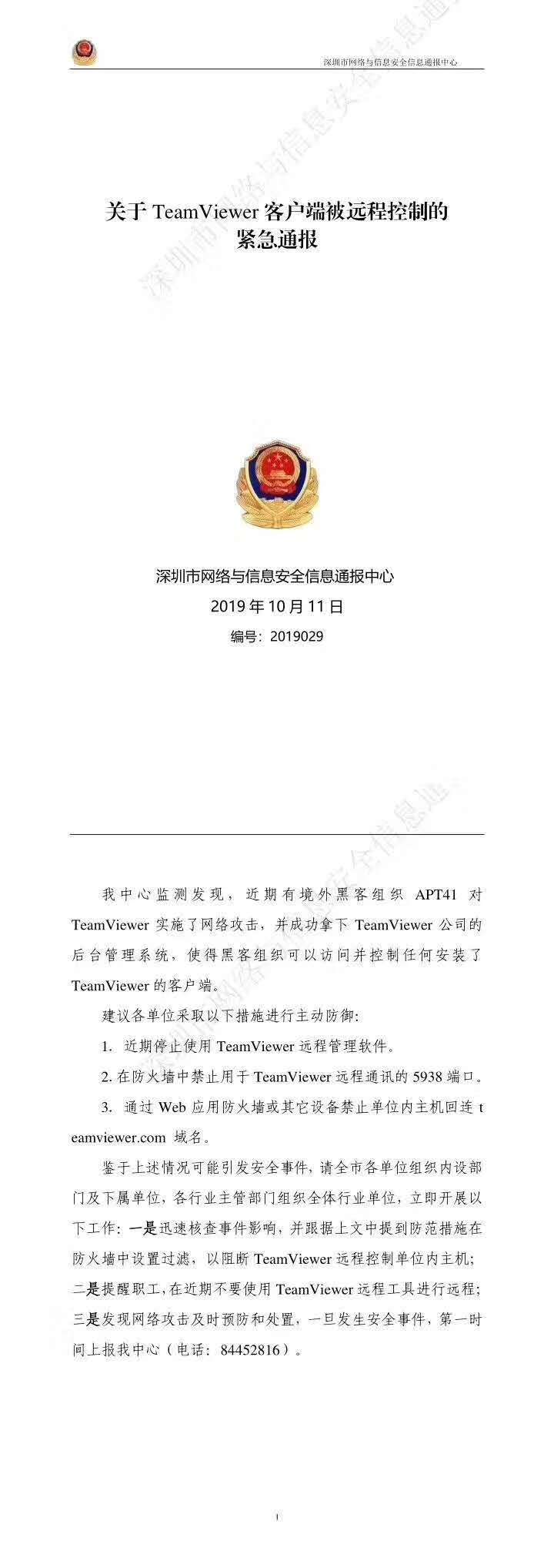 根據(jù)深圳市網(wǎng)絡(luò)與信息安全信息通報(bào)中心檢測(cè)發(fā)現(xiàn),近期有境外黑客組織APT41對(duì)TeamViewer 實(shí)施了網(wǎng)絡(luò)攻擊,并成功拿下TeamViewer 公司的后臺(tái)管理系統(tǒng),使得黑客組織可以訪問并控制任何安裝了TeamViewer 的客戶端。